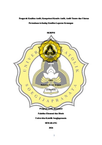 SANJAYA, FALENTINO FARREL (2026) PENGARUH KUALITAS AUDIT , KOMPENTENSI KOMITE AUDIT, AUDIT TENURE DAN UKURAN PERUSAHAAN TERHADAP KUALITAS LAPORAN KEUANGAN. S1 thesis, UNIVERSITAS KHATOLIK SOEGIJAPRANATA.