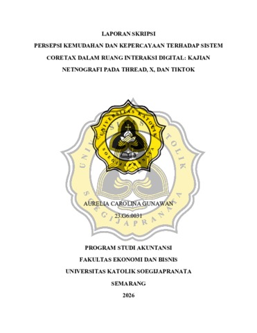 GUNAWAN, AURELIA CAROLINA (2026) PERSEPSI KEMUDAHAN DAN KEPERCAYAAN TERHADAP SISTEMCORETAX DALAM RUANG INTERAKSI DIGITAL: KAJIAN NETNOGRAFI PADA THREAD, X, DAN TIKTOK. S1 thesis, UNIVERSITAS KHATOLIK SOEGIJAPRANATA.