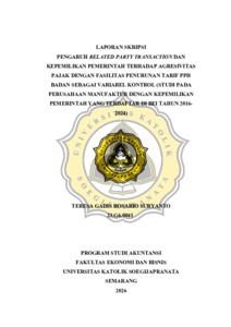 SURYANTO, TERESA GADIS ROSARIO (2026) PENGARUH RELATED PARTY TRANSACTION DAN KEPEMILIKAN PEMERINTAH TERHADAP AGRESIVITAS PAJAK DENGAN FASILITAS PENURUNAN TARIF PPH BADAN SEBAGAI VARIABEL KONTROL (STUDI PADA PERUSAHAAN MANUFAKTUR DENGAN KEPEMILIKAN PEMERINTAH YANG TERDAFTAR DI BEI TAHUN 20162024). S1 thesis, UNIVERSITAS KHATOLIK SOEGIJAPRANATA.