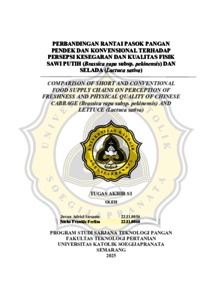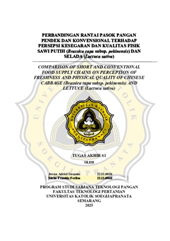 SUSANTO, JOVAN ADRIEL and FERLIM, NICKO FRAKIE (2026) PERBANDINGAN RANTAI PASOK PANGAN PENDEK DAN KONVENSIONAL TERHADAP PERSEPSI KESEGARAN DAN KUALITAS FISIK SAWI PUTIH (Brassica rapa subsp. pekinensis) DAN SELADA (Lactuca sativa). S1 thesis, UNIVERSITAS KHATOLIK SOEGIJAPRANATA.