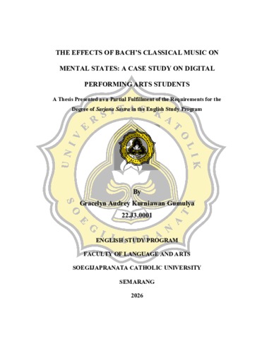 GUMULYA, GRACELYN AUDREY KURNIAWAN (2026) THE EFFECTS OF BACH’S CLASSICAL MUSIC ON MENTAL STATES: A CASE STUDY ON DIGITAL PERFORMING ARTS STUDENTS. S1 thesis, UNIVERSITAS KHATOLIK SOEGIJAPRANATA.