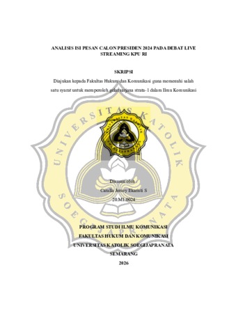 EKARISTI S, CARALLA JERSEY (2026) ANALISIS ISI PESAN CALON PRESIDEN 2024 PADA DEBAT LIVE STREAMING KPU RI. S1 thesis, UNIVERSITAS KHATOLIK SOEGIJAPRANATA.