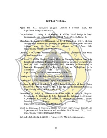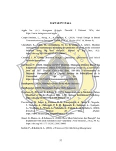 Penelitian ini mengkaji visual brand communication Apple Inc. melalui akun Instagram resmi @Apple dengan fokus pada bagaimana elemen visual digunakan untuk menyampaikan identitas brand tanpa menampilkan promosi produk secara eksplisit. Penelitian ini penting dilakukan mengingat Instagram merupakan platform media sosial berbasis visual yang memiliki peran strategis dalam praktik komunikasi brand di era digital, khususnya bagi brand global yang mengandalkan kekuatan visual sebagai bahasa utama komunikasi. Penelitian ini menggunakan pendekatan kualitatif dengan metode wawancara mendalam terhadap delapan pengguna produk Apple serta observasi terhadap konten visual pada akun Instagram @Apple. Pemilihan informan dilakukan secara purposive dengan mempertimbangkan pengalaman penggunaan produk Apple dan paparan terhadap konten visual brand. Data dianalisis menggunakan teknik analisis data kualitatif melalui tahapan reduksi data, penyajian data, dan penarikan kesimpulan, serta diperkuat dengan triangulasi data antara persepsi informan dan kanal resmi Apple. Hasil penelitian menunjukkan bahwa visual pada akun Instagram @Apple dipersepsikan sebagai estetik, konsisten, dan memiliki karakter visual yang jelas. Mayoritas informan menilai bahwa Apple lebih menonjolkan hasil penggunaan dan pengalaman pengguna dibandingkan menampilkan produk secara langsung. Pola visual tersebut mencerminkan penerapan konsep visual brand communication dan experience-based communication, di mana visual berfungsi sebagai pembawa makna dan identitas brand melalui pengalaman, bukan melalui pesan verbal atau promosi konvensional. Elemen visual seperti warna, komposisi, tone, serta pemanfaatan user generated content membentuk konsistensi visual yang dapat dikenali dan berfungsi sebagai visual signature brand. Temuan ini menunjukkan bahwa visual Instagram @Apple berperan sebagai sistem komunikasi utama dalam membangun identitas visual brand secara berkelanjutan. Penelitian ini diharapkan dapat memberikan kontribusi teoretis dan praktis dalam kajian komunikasi visual, khususnya terkait penerapan visual brand communication pada media sosial berbasis visual.