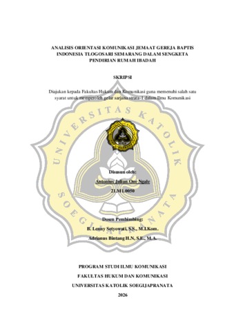 NGALE, ANTONIUS JULIAN ONE (2026) ANALISIS ORIENTASI KOMUNIKASI JEMAAT GEREJA BAPTIS INDONESIA TLOGOSARI SEMARANG DALAM SENGKETA PENDIRIAN RUMAH IBADAH. S1 thesis, UNIVERSITAS KHATOLIK SOEGIJAPRANATA.