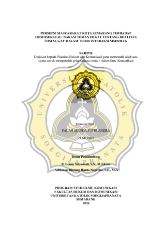 ANDRA, FALAH ADINDA PUTRI (2026) PERSEPSI MASYARAKAT KOTA SEMARANG TERHADAP HOMOSEKSUAL: NARASI TEMAN DEKAT TENTANG REALITAS SOSIAL GAY DALAM TEORI INTERAKSI SIMBOLIK. S1 thesis, UNIVERSITAS KHATOLIK SOEGIJAPRANATA.
