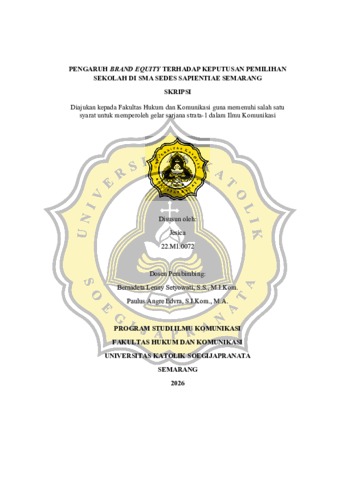JESICA, JESICA (2026) PENGARUH BRAND EQUITY TERHADAP KEPUTUSAN PEMILIHAN SEKOLAH DI SMA SEDES SAPIENTIAE SEMARANG. S1 thesis, UNIVERSITAS KHATOLIK SOEGIJAPRANATA.