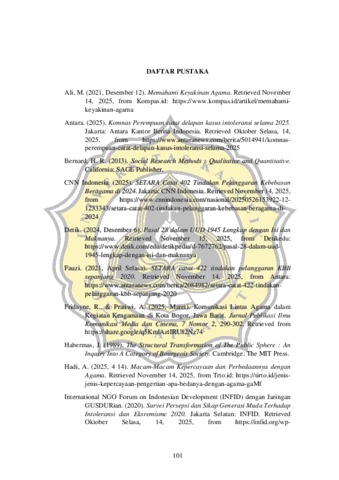 Maraknya kasus intoleransi di Indonesia mencerminkan nilai-nilai Pancasila belum melekat kuat pada setiap individu. Urgensi penelitian ini berfokus pada perlunya ruang perjumpaan alternatif untuk memediasi prasangka antarumat beragama di tengah polarisasi sosial digital maupun nyata. Kegiatan Pondok Damai diinisiasi oleh Persaudaraan Lintas Agama (Pelita) sebagai sarana generasi muda mengenal setiap agama dan kepercayaan secara langsung. Penelitian ini bertujuan menganalisis Peranan Pondok Damai Sebagai Ruang Konektif dan Komunikatif Generasi Z dalam membangun inklusivitas melalui perspektif Mediated Citizenship von Lieres dan teori ruang publik Jurgen Habermas. Mediated Citizenship digunakan untuk membedah peran aktor mediator dalam mengakomodasi kepentingan warga, sementara teori ruang publik menguji terciptanya diskursus rasional kritis yang setara. Penelitian kualitatif ini menggunakan pendekatan studi kasus. Pengumpulan data dilakukan melalui observasi partisipatif dan wawancara mendalam terhadap lima informan lintas agama dan kepercayaan yaitu Islam Ahmadiyah, Kepercayaan Kejawen Maneges, Konghucu serta pihak panitia dan penyelenggara. Validitas data diuji melalui triangulasi sumber dan metode. Teknik analisis data mencakup proses interaktif yang terdiri dari reduksi data, penyajian data (data display), serta penarikan kesimpulan dan verifikasi data. Temuan penelitian menunjukkan Pondok Damai bukan berperan sebagai mediator warga dan negara, melainkan menghadirkan ruang rekognisi kewargaan yang memunculkan pengakuan antarwarga dari berbagai latar belakang. Hasil penelitian mengungkapkan Pondok Damai berfungsi sebagai ruang konektif yang membangun rasa aman dan kepercayaan antarpeserta. Ruang komunikatif terwujud melalui dialog terbuka, setara, dan berorientasi pada pemahaman bersama, bukan perdebatan atau paksaan. Kebaruan penelitian ini berfokus pada pemaknaan Pondok Damai sebagai ruang konektif-komunikatif yang membentuk kesadaran bersama secara horizontal. Kesimpulan penelitian menunjukkan bahwa praktik inklusivitas di Pondok Damai berhasil memperkokoh relasi antarindividu melalui tindakan komunikatif yang menjunjung tinggi prinsip kesetaraan dan pengakuan terhadap hak warga negara.
