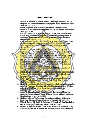 Latar Belakang: Sindrom dispepsia merupakan gangguan gastrointestinal yang memiliki prevalensi tinggi pada tenaga kesehatan, seringkali dipicu oleh mekanisme koping gaya hidup tidak sehat seperti merokok dan konsumsi kopi dalam menghadapi beban kerja. Namun, terdapat inkonsistensi hasil pada penelitian terdahulu mengenai hubungan dosis-respons kopi dan rokok terhadap dispepsia, serta terbatasnya data empiris spesifik pada populasi tenaga kerja rumah sakit di wilayah Kupang. Tujuan: Penelitian ini bertujuan untuk menganalisis pengaruh perilaku merokok dan konsumsi kopi terhadap kejadian sindrom dispepsia pada karyawan Rumah Sakit Tk.III 09.06.01 Wira Sakti Kupang. Metode: Penelitian ini merupakan studi observasional analitik dengan desain crosssectional. Sampel penelitian berjumlah 180 karyawan yang dipilih menggunakan teknik proportional stratified random sampling. Variabel independen (merokok dan kopi) diukur menggunakan Indeks Brinkman dan kuesioner frekuensi konsumsi, sedangkan variabel dependen (sindrom dispepsia) diukur menggunakan kriteria Rome IV. Analisis data dilakukan menggunakan uji Chi-Square. Hasil: Sebanyak 32,8% karyawan teridentifikasi mengalami sindrom dispepsia. Hasil analisis bivariat menunjukkan terdapat hubungan yang signifikan antara perilaku merokok (p-value = 0,002) dan konsumsi kopi (p-value = 0,006) dengan kejadian sindrom dispepsia pada karyawan Rumah Sakit Tk.III 09.06.01 Wira Sakti Kupang. Kesimpulan: Terdapat pengaruh yang signifikan antara perilaku merokok dan konsumsi kopi terhadap kejadian sindrom dispepsia pada karyawan rumah sakit. Disarankan bagi instansi terkait untuk memprioritaskan program berhenti merokok (smoking cessation) dan edukasi kesehatan mengenai batasan aman konsumsi kafein sebagai upaya preventif kesehatan kerja.