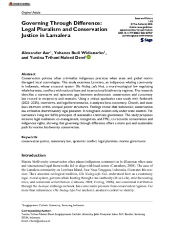 Dewi, Yustina Trihoni Nalesti Governing Through Difference: Legal Pluralism and Conservation Justice in Lamalera. Space and Culture, 00. 0-1. ISSN ISSN: 1206-3312 Online ISSN: 1552-8308