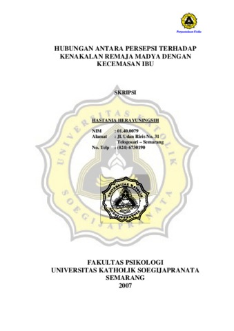 HERAYUNINGSIH, HASTANIA (2007) HUBUNGAN ANTARA PERSEPSI TERHADAP KENAKALAN REMAJA MADYA DENGAN KECEMASAN IBU. Other thesis, PRODI PSIKOLOGI UNIKA SOEGIJAPRANATA.