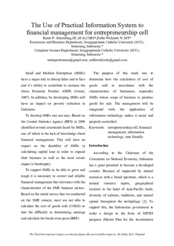 Sihombing, Ranto P. and Widyarto Nugroho, Erdhi The Use of Practical Information System to Financial Management for Entrepreneurship Cell. The Third International Congress on Interdisciplinary Research and Development, 30 - 31 May 2013, Thailand.