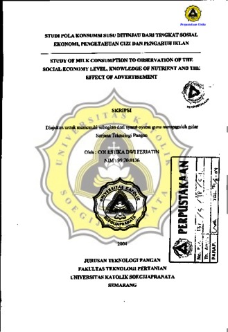 Feriatin, Colestika Dwi (2004) STUDI POLA KONSUMSI SUSU DITINJAU DARI TINGKAT SO SIAL EKONOMI, PENGETAHUAN GIZI DAN PENGARUH IKLAN. Other thesis, Fakultas Teknologi Pertanian Unika Soegijapranata.