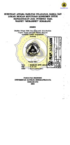 Aryanto, Bambang Dwi Aryanto (2001) HUBUNGAN ANTARA FASILITAS, PELAYANAN, HARGA DAN LOKASI DENGAN KEPUTUSAN KONSUMEN UNTUK MENGGUNAKAN JASA INTERNET PADA WARNET "MURADI NET" SEMARANG. Other thesis, Fakultas Ekonomi dan Bisnis UNIKA Soegijapranata.