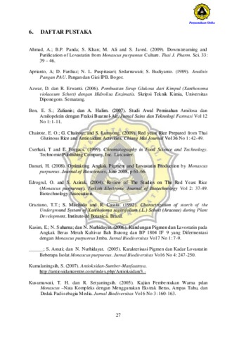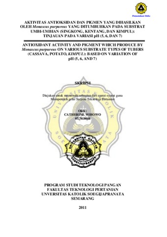 WIBOWO, CATHERINE (2011) AKTIVITAS ANTIOKSIDAN DAN PIGMEN YANG DIHASILKAN OLEH Monascus purpureus YANG DITUMBUHKAN PADA SUBSTRAT UMBI-UMBIAN (SINGKONG, KENTANG, DAN KIMPUL): TINJAUAN PADA VARIASI pH (5, 6, DAN 7). Other thesis, Prodi Teknologi Pertanian Unika Soegijapranata.
