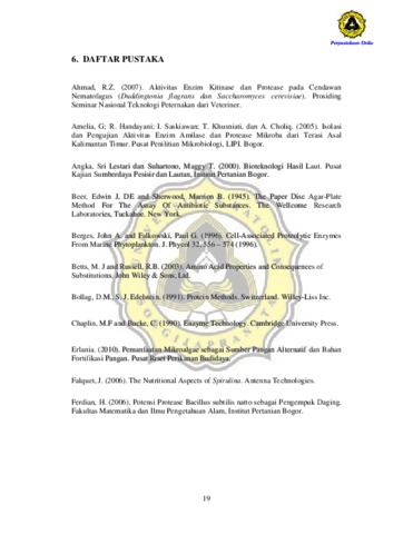 Protease merupakan salah satu enzim yang sangat berperan di dalam industri pangan. Protease banyak dimanfaatkan untuk meningkatkan elastistas gluten pada proses pembuatan roti, meningkatkan tekstur crispy pada cookies dan crackers, serta berperan dalam proses pembuatan keju. Mikroalga memiliki potensi untuk menghasilkan protease, seperti pada kelompok Cyanobacteria yang memiliki protease endoseluler untuk mendegradasi fikobiliprotein pada saat kehabisan nutrisi. Protease endoseluler berperan di dalam membentuk dan melepaskan sinyal peptida intraseluler, pengaturan metabolik hingga pemisahan enzim secara selektif dan menghilangkan protein yang tidak berguna. Protease endoseluler bekerja lebih spesifik dibandingkan dengan protease ekstraseluler. Penelitian ini bertujuan untuk mengetahui secara kualitatif enzim protease endoseluler dan menguji aktivitasnya pada Spirulina platensis. Konsentrasi protein diukur menggunakan metode Bradford. Keberadaan enzim protease endoseluler diuji secara kualitatif (menggunakan metode kertas cakram) dan kuantitatif (metode Walter). Aktivitas enzim spesifik juga dihitung dengan cara aktivitas enzim per unit dibagi dengan konsentrasi protein. Dari hasil penelitian didapatkan, konsentrasi protein pada Spirulina platensis adalah 653,7 mg/gram berat basah Spirulina platensis. Spirulina platensis memiliki aktivitas enzim protease dengan zona yang tidak beraturan. Metode kertas cakram ini memiliki kelemahan yaitu ukuran zona bening yang terbentuk tergantung dari kondisi inkubasi, inokulum, predifusi, preinkubasi dan ketebalan medium. Apabila keempat faktor tersebut tidak sesuai, maka hasil dari metode kertas cakram relatif sulit untuk diintepretasikan. Aktivitas protease endoseluler Spirulina platensis adalah sebesar 0,0387 unit aktivitas. Aktivitas spesifik protease endoseluler Spirulina platensis adalah sebesar 0,0591 unit aktivitas/mg protein.