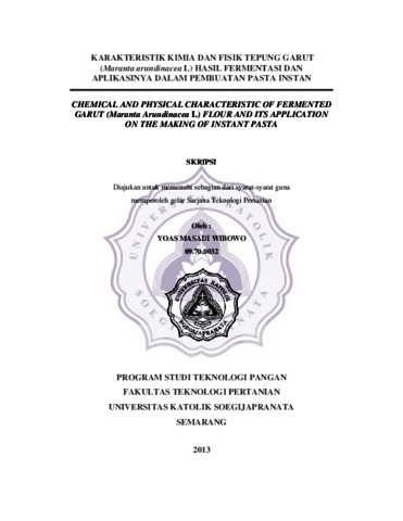 WIBOWO, YOAS MASADI (2013) KARAKTERISTIK KIMIA DAN FISIK TEPUNG GARUT (Maranta arundinacea L) HASIL FERMENTASI DAN APLIKASINYA DALAM PEMBUATAN PASTA INSTAN. Other thesis, Prodi Teknologi Pertanian Unika Soegijapranata.