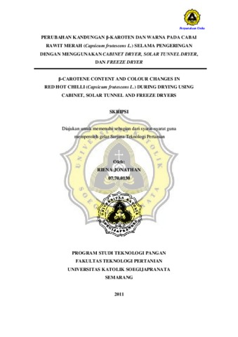 JONATHAN, RIENA (2011) PERUBAHAN KANDUNGAN β-KAROTEN DAN WARNA PADA CABAI RAWIT MERAH (Capsicum frutescens L.) SELAMA PENGERINGAN DENGAN MENGGUNAKAN CABINET DRYER, SOLAR TUNNEL DRYER, DAN FREEZE DRYER. Other thesis, Prodi Teknologi Pertanian Unika Soegijapranata.