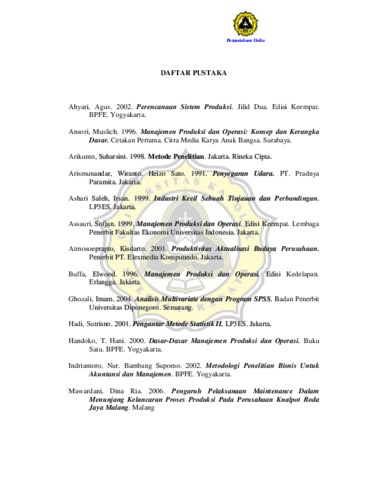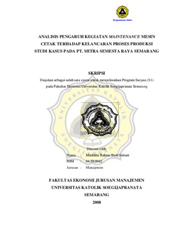 Setiani, Mathilda Rahma Budi (2008) ANALISIS PENGARUH KEGIATAN MAINTENANCE MESIN CETAK TERHADAP KELANCARAN PROSES PRODUKSI STUDI KASUS PADA PT. MITRA SEMESTA RAYA SEMARANG. Other thesis, Prodi Manajemen Unika Soegijapranata.