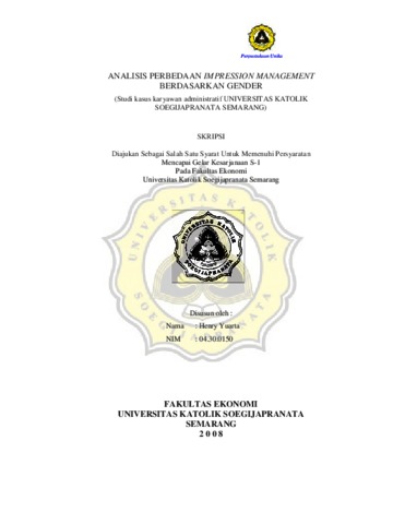 Yuarta, Henry (2008) ANALISIS PERBEDAAN IMPRESSION MANAGEMENT BERDASARKAN GENDER (Studi kasus karyawan administratif UNIVERSITAS KATOLIK SOEGIJAPRANATA SEMARANG). Other thesis, Prodi Manajemen Unika Soegijpranata.