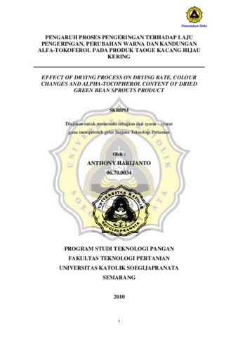 HARIJANTO, ANTHONY (2010) PENGARUH PROSES PENGERINGAN TERHADAP LAJU PENGERINGAN, PERUBAHAN WARNA DAN KANDUNGAN ALFA-TOKOFEROL PADA PRODUK TAOGE KACANG HIJAU KERING. Other thesis, Prodi Teknologi Pertanian Unika Soegijapranata.