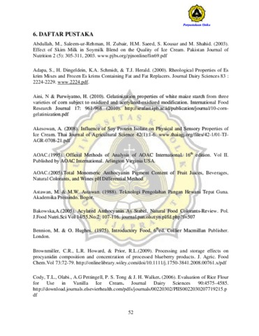 Saat ini es krim merupakan salah satu makanan penutup yang terkenal dan disukai oleh semua kalangan. Es krim biasanya tidak memiliki senyawa fungsional seperti antioksidan alami. Beras hitam memiliki pigmen antosianin di mana aktivitas antioksidannya berguna dalam pencegahan penyakit arterosklerosis. Oleh karena itu es krim ditambahkan dalam penelitian ini sebagai pengembangan dari es krim dengan kandungan antioksidan alami. Dalam penelitian ini bubuk beras hitam ditambahkan dengan konsentrasi 10%, 20%, 30% dan 40%. Penelitian ini bertujuan mengetahui karakteristik kimia, kestabilan antosianin, karakteristik fisik dan sensori es krim dengan penambahan bubuk beras hitam secara langsung di dalam formulasi es krim. Parameter analisa fisik yang diuji meliputi overrun, viskositas, hardness, melting time, dan melting rate. Parameter analisa kimia meliputi pengujian total padatan, lemak, protein, abu, serat kasar dan stabilitas antosianin selama 2 minggu. Sedangkan untuk analisa sensoris meliputi, warna, tekstur, rasa, dan overall. Perlakuan penambahan konsentrasi beras hitam menyebabkan nilai viskositas, hardness ,melting time, total padatan, lemak, protein dan serat kasar mengalami peningkatan. Sedangkan nilai melting rate dan overrun mengalami penurunan dengan penambahan bubuk beras hitam. Perlakuan penambahan beras hitam memberi nilai fungsional lebih yaitu dengan adanya kandungan antosianin. Namun selama penyimpanan dalam freezer kandungan antosianin pada es krim tidak stabil dikarenakan pH es krim yang netral. Berdasarkan analisa sensoris, es krim yang paling disukai konsumen adalah es krim dengan konsentrasi sebesar 20% dengan tingkat penerimaan rata-rata (overall) sebesar 3.47. Es krim ini memiliki nilai overrun sebesar 34%, Melting time sebesar 59.80 menit, hardness sebesar 1.63 kgf, dan memiliki kandungan kimia berupa total padatan sebesar 34.57 %; lemak 7.73%; abu 0.64%; serat kasar 1.54% dan protein sebesar 5.07%.