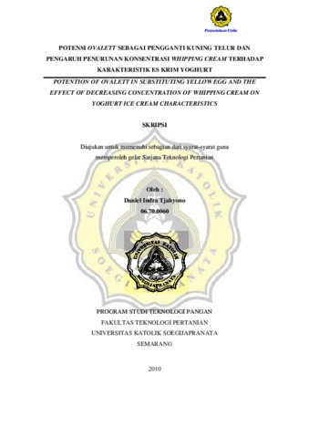 TJAHYONO, DANIEL INDRA (2010) POTENSI OVALETT SEBAGAI PENGGANTI KUNING TELUR DAN PENGARUH PENURUNAN KONSENTRASI WHIPPING CREAM TERHADAP KARAKTERISTIK ES KRIM YOGHURT. Other thesis, Prodi Teknologi Pertanian Unika Soegijapranata.