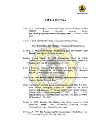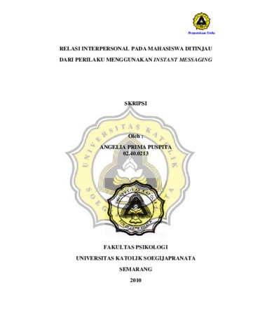 PUSPITA, ANGELIA PRIMA (2010) RELASI INTERPERSONAL PADA MAHASISWA DITINJAU DARI PERILAKU MENGGUNAKAN INSTANT MESSAGING. Other thesis, Prodi Psikologi Unika Soegijapranata Semarang.