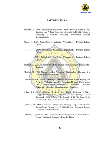 SARI, TYAS NANI KUSUMO (2008) KEMAMPUAN ISTERI MENGELOLA KONFLIK DALAM PERKAWINAN DITINJAU DARI KECERDASAN EMOSIONAL. Other thesis, Prodi Psikologi Unika Soegijapranata Semarang.