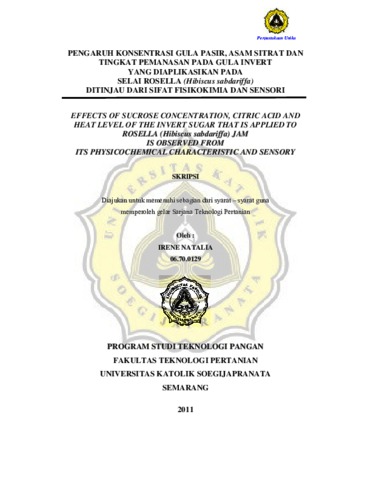 NATALIA, IRENE (2011) PENGARUH KONSENTRASI GULA PASIR, ASAM SITRAT DAN TINGKAT PEMANASAN PADA GULA INVERT YANG DIAPLIKASIKAN PADA SELAI ROSELLA (Hibiscus sabdariffa) DITINJAU DARI SIFAT FISIKOKIMIA DAN SENSORI. Other thesis, Prodi Teknologi Pertanian Unika Soegijapranata.