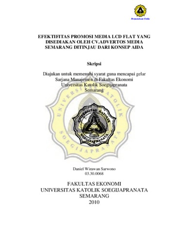 Sarwono, Daniel Wirawan (2010) EFEKTIFITAS PROMOSI MEDIA LCD FLAT YANG DISEDIAKAN OLEH CV.ADVERTOS MEDIA SEMARANG DITINJAU DARI KONSEP AIDA. Other thesis, Prodi Manajemen Unika Soegijapranata.