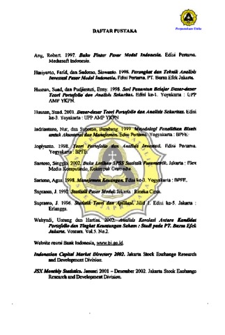 Pada era globalisasi sekarang ini, terjadi perkembangan yang sangat pesat dalam bidang perekonomian di dunia, termasuk Indonesia. Hal tersebut terlihat dari banyaknya perusahaan-perusahaan dan lembaga-lembaga keuangan yang didirikan sebagai wujud berkembangnya perekonomian di tanah air. Kemajuan perekonomian dunia itu juga menyebabkan banyaknya orang-orang yang turnt berkecimpung dalam dunia pasar modal, yang tentu saja mempunyai tujuan untuk memperoleh keuntungan yang sebesar-besamya. Namun untuk berkecimpung dalam dunia pasar modal, para investor harus melakukan analisis terlebih dahulu untuk dapat menerapkan strategi apa yang baik sebelum melakukan keputusan investasi mengenai saham apa yang dipilih, berapa banyak dan kapan investasi yang akan dilakukan agar tingkat keuntungan yang diperoleh dalam investasi tersebut akSitnal atau paling tidak meminimalkan tingkat risiko saham. Ha (ni ted~ai dengan silGip p,ara investor yang sebagian besar adalah risk averte • yakni para investor mengingjnkan hasil perolehan atau return yang tinggi de gan risiko seminimaLmungkin. Para investoli seriogkali menanamkan dananya Rfda lebih dari satu sekuritas den!fcU1: preporsi tertentu atau yang diseb t investas' ~rtofolio, dengan maksud untuk meminimwnkan risiko y akan ditanggungnya-: al ini didasari bahwa apabila . nvestor menempa .J selwuh dananxa paqa satu perusahaan tertentu saja, maka risiko yang Jlkan ditanggung jika ~wsahaan tersebut mengalami ke · alan akan lebin besar aripada apabila Ii vestor tersebut membagi dan )I1a untuk tlitaliiamlan aCla 6eberapa aset. Untuk membentuk sebuati portofolio ~ang ensien, . perlukan analisis untuk mernilih s&m mana saja yan~-roasuk dalam port olio tersebut, yang dikatakan sebagai andidat portofolio. -Salah sat cara dal elakukan analisis adalah dengan model i deks tunggal yang oltlasarkan P M pengamatan bahwa harga dari suatu sekuritaS berfluktuasi searah dengan indeks harga pasar. Dalam penelitian ini digunakan . ndeRS ~r yang disus . sendiri, karena dari beberapa penelitian sebelwnnya menunju kett(!ak konsistenan hasil dalam pengukuran hubungan antara beta saham dengan return, namun menunjukkan adanya hubungan antara beta dengan return saham apabila digunakan indeks pasar yang disusun sendiri, meskipun hubungannya sangat kecil. Oleh karena itu, penelitian ini dilakukan dengan tujuan untuk mengetahui saham mana saja yang menjadi kandidat portofolio dan apakah terdapat hubungan antara excess return to beta dengan rata-rata return saham kandidat porto folio dengan indeks pasar yang disusun sendiri, dengan periode pengamatan Januari 2001 sampai dengan Desember 2002. Sampel penelitian diambil dari daftar 20 Most Active Stocks by Trading Frequency, yaitu saham listed yang masuk daftar tersebut sebanyak minimal 2 kali selama periode pengamatan. diperoleh 48 saham. Setelah memperoleh 48 saham sebagai sampel, dilakukan perhitungan indeks pasar yaitu dengan cara mengkalikan harga penutupan bulanan tiap saham dengan jumlah saham yang dikeluarkan oleh masing-masing saham, kemudian membaginya dengan nilai dasar (barga penutupan x jwnlah saham yang dikeluarkan pada bulan dasar, yang ditetapkan bulan Januari 2001). Diperoleh expected return market /E(Rm) sebesar 0,575%, varian pasar sebesar 0,8896515%. Kemudian dilakukan perhitungan return individual (Ri), expected return saham individual / E(Ri) beta individual dan risiko unik pada masing-masing saham sampel tersebut. Setelah itu dieari excess return to beta (ERB) masingmasing saham dengan cara mengurangkan E(Ri) dengan return aset bebas risiko (dalam hal ini tingkat suku bunga SBI, yaitu sebesar 0,0132361), kemudian membaginya dengan beta individual masing-masing saham. Syarat saham yang akan masuk dalam kandidat portofolio adalah saham yang memiliki E(Ri), ERB dan beta bemilai positif, dari 48 saham sampel diperoleh 12 saham yang memenuhi persyaratan. Setelah diurutkan dari nilai ERB terbesar sampai yang terkeeil yaitu saham LPBN(0,060557), UL TJ(0,036914), BBCA(0,03292), BNTR(0,032555), AALI(0,022553), PNBN(0,021403), JAKA(0,018827), JIHD(0,016457), MEDC(0,012342), ASlI(0,011729), TLKM(0,011 52), SMGR(0,010511) Setelah melalui selelCsi eoua yaitu cut---o rate (Ci), diperoleh 6 saham yang memiliki ERB ebi besar daD nilai Ci-nya, ~n~n kata lain terdapat· 6 saham yang dijadikIDt kandidat portofolio. Saham-saha , tersebut kemudian dihitun~ berapa proporsi ~ -eseluruhan dana yang a n di~amkan, yaitu proporsl terbesar ;& saham BNTR sebeSar 53,510276%, kemudian pada urutan kedua saham BBCA yaitu selle · r 19,357313%, s anjutnya saham ULTJ(11,81369 %), satiam LPBN(6,9853131%), saham ULI(6,628114%), sedangkan propg i dana paling sed 16t"'" diinvestasikiln pada saham PNBN yaitu sebesar 1,1 52271%. Tujuan Wedua d!ri penelitian ini adalah untuk meng~tahui bagaimana hubungan an ERB kaildidat portofolio dengan return rata- , saham di masa mendatang. Untul itu dilaMan an,lisj -ot:elasi antara ERB n expected return keenam saham menjadi kandidat-~rtofolio. Den~ anal isis korelasi product moment Pear,. 'n 's di~roleh kOeii-sien korelasi/vang kuat yaitu sebesar 0,916. • .. r Dari hasil tersetiu diperolehesimpulan bahwa selama peri ode pengamatan dari 48 saham diperoleli sabaill sebagai kandidat porto folio seperti tersebut diatas. Kesimpulan yang ke-dua adalah terdapat korelasi atau hubungan yang kuat dan searah antara ERB kandidat portofolio dengan return rata-rata di masa mendatang, yaitu dengan koefisien korelasi sebesar 0,916 yang hampir mendekati 1. Hal ini menunjukkan bahwa pada Bursa Efek Jakarta, model indeks tunggal dapat digunakan untuk menentukan beta yaitu dengan membentuk indeks pasar sendiri (securities selection)