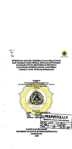 NATASETIA, HERMAS (1999) HUBUNGAN ANTARA KEPERCAYAAN ,PELAYANAN DAN TINGKAT SUKU BUNGA DENGAN KEPUTUSAN NASABAH UNTUK MENYIMPAN DEPOSITO PADA BANK INTERNATIONAL INDONESIA CABANG GANG TENGAH SEMARANG. Other thesis, Prodi Manajemen Unika Soegijapranata.