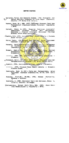 Akhir-akhir ini investasi da lam bentLi I-:. sah am nampi:lk s:;:)m~kin diminati sehingga p,",sar modal sebagai tempat transi;l.ks .i. sur-at berharga menj adi berkembang. Disini sa ham biasa di tr E>n si\ksi ki:";n dalam harga yang berflLlkl:Llasi me ngikuti key. U.;ltan pasar (penawaran dan permintaan). H.?;l in i se l ain d i s2babl~,oo;. n oleh berbagai keadaan umum diluar kant ro l emiten , jUg2 dapat disebabkan oleh adanya penil.3ian dari pa r a inv~5tor berdasClrkan kondisi dar i do?li",m emiten itu sendiri. PeniIai<:>'lj para investor ini ditampilkan me ] slui analisis terhadap kinerja operasional keuangan emiten. Be rdasarkan hal diatas maka judul dari penelitian inl adalah "Anal isis I<orelasi Antal~ a Kinel'"ja sahaan dan Harga Saham Biasanya" . riner j a emit-en gambaran terhadap kondisi keuangan emiten mencerminkan seberapa (emiten) dalam r angka l ebi h baik dengan tersebut. Dalam men tersebut dapat paya yang d' leh r-usahaan 1 1 • , an pene 1 pf:..aal1 n ~ ' gandal ~ ang yang emiten konsep Economic ValuE' sebagai alat untuk ";i~ta,-~:~;~an konsep EVA sec 11, a rS"turn yang di tuntut pa d k""d ·,_~,"r pepi,ed 1a dana bagi ~~egiatan 0 I d.~~li:{ 'r":.~~~,~ tersebut dinyatakan dengan 5';r",y.uc.,r yang ada_ Untuk EVi Atu lashee a:l:~~a; J'~~::~:;;\~~:~~~~l~11~:~~;~~~;~:~~ J. Earning Before Interest pajar. d an Cost of Cap biaya modal terse but dari biaya hutang dan I modal yang digunakan u ntuk rhitungan ini menggambarkan t ingkat ian '~n investor (pemegang saham dan tas ' sel dipinjamkan pad a emiten. Konsep EVA nilai s is; ... dari laba operasional bersih ten setelah seluruh ting~; at pengemba l ian yang par.;!. investor di penuhi. Ber-patokan pada pengertian ini maka dapat diliha t bahwa konsep EVA sangat cocoi-: dijadikan alat penilai kinerja e miten. Ukuran dari EVA adalah sebagai berikut: Jika EVA > 0 , rnaka kita telah menambahkan kedalam perusahi? i?n (bisnis) ter-sebL\t. nilai ekonom.i.s Jika EVA = O~ mak a artinya bahwa secar-a ekonomis kita ~;arena semua laba ~, ita gLlna~;an L\ntu~; membaya r ke\.',1ajiban kreditur dan pemegang saham. impas kepada Jika EVA < O~ mak a kita tidak member-ikan nilai tambah kepada perusahaan tersebLlt karena laba yang tersedia tidak bisa memenuhi h arapan-harapan penyandang dana ter-utama pemegang saham. Lokasi peneli tian y~ng dilakukan disini adalah di Bursa Efek SLlr-abaya (BES)~ yang selama ini lebih dikenal dengan transaksi jual beli ob l i gasinya dar-i pada transaksi ju~1 beli saham iii biasanya . penelitian industr-i Sedangkan perusahaan (emiten) yang diteliti dalam disini adalah per-Llsahaan yang berger-ak dibidang semen , dengan a !asan bahwa selama ada kegiatan pembangunan f isik pastilah membutuhkan semen, rnaka tidak mengherankan j ika saham per-usahaan semen tersebut masih prospektif. Seperti tel a h dije!askan diatas bahwa dalam melakukan penilaian terhadap kiner-ja emiten dilakukan dengcln mengguna kan Konsep EVA. Sedangkan anal isis yang bertujuan Llntuk melihat ada ata!..l tidaknya hLlbungan antara kinerja perusaha.:ln (emiten) dan harga sa ham biasanya selama enam tahLln per-iode penelitian (tahun 1992-1997), dilakLlkan dengan menggunco.kan perhitLtngan koefi s ien korelasi dan pad a akhirnya akan dilakukan pengLlJian terhadap hasil dar-i per-hitungan koefisien kor-elasi ter-sebut. Sete lah d i la~a,\ k an pen i laian ter"tadap kinerja e mi ten ter-nyata diperol e h hasi 1 sebagai berikut: l-' tuk PT Semen Gres i k selama enam tahlln penel itian t~~ /s~<_ ra keseh,rllhan kiner j a perllsahaan buruk karena Ie >£ y-!'k )h\DQ "lai negati f. Untuk PT Semen Cibinong selam oS¥ am ta~LLn penel i ti tern yata secar-a keseluruhan kinerja pe !3~aan bai~ . Setelah di lakuk, perhltu Qa re~sief"l kor-~' si d iperoleh hasil sebagai berik : un t PT S emen Gr: sik J. eroleh angka koefisien korel asi ebilsa -0,6285, yang ti arti an tara kinerja perl.lsah~ ~dan rga saha ii\ s .any a terd hubungan yang negatif k~l<i'. Unt k PT Se,. Ci binon diPE¥! ( e h angka koefisien korel a ' seb sar O,~ 39~ 1 eng bera t i"' , wa an tara kiner j a per-LIsah aCl. dim harga .a "m .... h)~s~ nya erda a hubungan yang positif kuat. ~ Tetapi setel dilak uk .m ~nID.W~ hipotes "s ter1" at a angka koefisien korelas baik ~T Semen G~ es ~" m"ilUpl!.'r T s~m Cibinong diatas tidak sign "kan . 'iidak signif l kan in"i 9 rart · . Untuk PT Seme r J s _i k"r;' b 9-hwa t anda n ~gE<l..f da koefisien korelasi diatas 'abai ka saj~'la de Clan ha me lalui 2 var-iabel yai hl er-ja ~e.cLlbb:a a.~.da.!).oli' a;:'9a t! am biasanya kita tidak d apat yim p Lll ~n - ah w.a~k a kir:.1!.. ja pe r'"LIsahaan naik ma ka h ar-ga sah akan t;u rLln ;(2\t. aLl sebat " ;nya). Hanyalah suatu ke betLI lan jika .!,s.m....d angka . wa'ktL~pen @.. ' tian ini ter-jadi hu~ung an yang negati " ~Hcrb...'~rt b ahw a ada faktor la~n yang ber-per-an da am kon - - Untuk PT Semen Cibinong". dengan koefisien korelas :i.. yang positif kuat tetapi tidak signifikan dapat diartikan bahwa sebenarny a terdapa t fa k tor-faktor lain yang mempLlnyai per-anan dalam kond i si ini~ Faktor lain ini an tara lain sentimen pasar-, spel-; Lllasi~ iSLI-isu dan lain sebagainya, tetapi faktor-faktor e ksternal ter- s ebLlt tidal-:: dibahas dalam penel i ti.an ini. Didapatnya hasil tidak signifikan diatas dapa t dis ebabkan oleh ber-bagai kemungkinan ~ seperti: kemugkinan sa ham jarang diperdagangkan sehingga harga sa ham yang a d a tidak mencerminkan per-Llbahan kiner- j a perLIsahaan, atau kemungkinan harga saha m y ang terlalu tinggi/bagus atau masyar-akat pemodal tidak tertarik pada saham tersebLlt sehingga adanya kenaikan kinerja belLlm tentu diikLlti terjadinya tr-ansaksi atas sahamnya , a tau juga kare na adanya kemLlngkinan faktor ekster-nal lebih dominan sebagai dasa r pengambi 1 an kepLI tusan investor