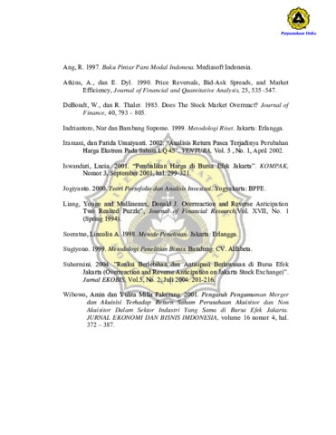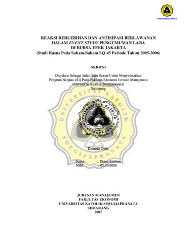 Santoso, Diana (2007) REAKSI BERLEBIHAN DAN ANTISIPASI BERLAWANAN DALAM EVENT STUDY PENGUMUMAN LABA DI BURSA EFEK JAKARTA (Studi Kasus Pada Saham-Saham LQ 45 Periode Tahun 2005-2006). Other thesis, Prodi Manajemen Unika Soegijapranata.