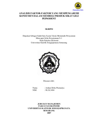 Pramudya, Ardian Delta (2007) ANALISIS FAKTOR-FAKTOR YANG MEMPENGARUHI KONSUMEN DALAM MEMBELI PRODUK SIKAT GIGI PEPSODENT. Other thesis, Fakultas Ekonomi dan Bisnis Universitas Katolik Soegijapranata.