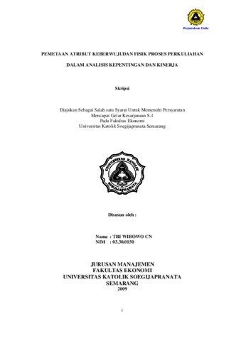 NUGROHO, TRI WIBOWO (2009) PEMETAAN ATRIBUT KEBERWUJUDAN FISIK PROSES PERKULIAHAN PEMETAAN ATRIBUT KEBERWUJUDAN FISIK PROSES PERKULIAHAN i DALAM ANALISIS KEPENTINGAN DAN KINERJ. Other thesis, Prodi Manajemen Unika Soegijapranata.