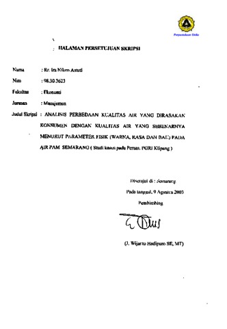 Astuti, Rr. Ira Niken (2003) ANALISIS PERBEDAAN KUALIT AS AIR YANG DIRASAKAN KONSUMEN DENGAN KUALIT AS AIR YANG SEBENARNY A MENURUT PARAMETER FISIK (WARNA, RASA DAN BAU) PADA AIR PAM SEMARANG (Studi kasus pada Perum. PGRI Klipang). Other thesis, Fakultas Ekonomi Dan Bisnis Universitas Katolik Soegijapranata.