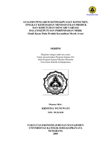 WUNUWATI, KRISTINA (2005) ANALISIS PENGARUH KETIDAKPUASAN KONSUMEN, TINGKAT KEMUDAHAN MENDAPATKAN PRODUK DAN KEBUTUHAN MENCARI VARIASI DALAM KEPUTUSAN PERPINDAHAN MERK (Studi Kasus Pada Produk Kecantikan Merek Avon). Other thesis, Fakultas Ekonomi Dan Bisnis Universitas Katolik Soegijapranata.