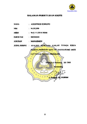 SUBROTO, AGUSTINUS (2003) ANALISIS PENENTUAN JUMLAH TENAGA KERJA BAGIAN PRODUKSI PADA PT. HADIKUSUMO BROS COY PUDAK PAYUNG SEMARANG. Other thesis, Prodi Manajemen Unika Soegijapranata.