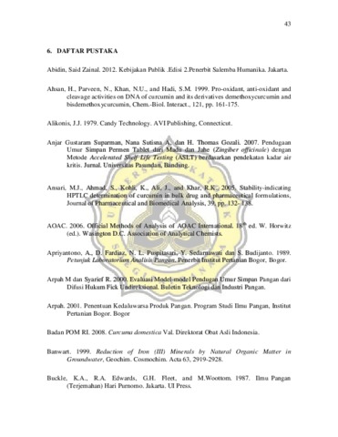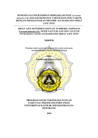 WIBOWO, STEPHANIE WIJAYANTI (2016) PENENTUAN UMUR SIMPAN SIMPLISIA KUNYIT (Curcuma domestica Val.) DALAM KEMASAN VAKUM DAN NON VAKUM DENGAN MENGGUNAKAN METODE ACCELERATED SHELF LIFE TEST. Other thesis, PRODI TEKNOLOGI PANGAN UNIKA SOEGIJAPRANATA SEMARANG.