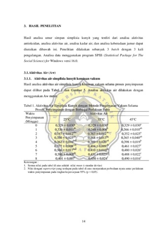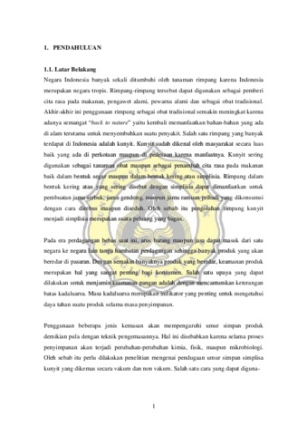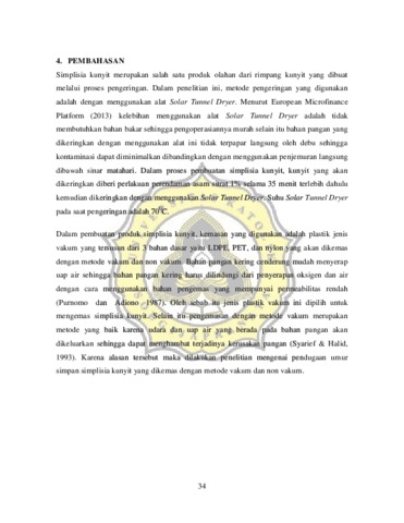 Kunyit (Curcuma domestica Val.) sering digunakan sebagai tanaman obat maupun sebagai penambah cita rasa pada makanan baik dalam bentuk segar maupun dalam bentuk kering. Salah satu metode pengeringan yang dapat digunakan adalah Solar Tunnel Drying. Solar Tunnel Dryer ini dipilih karena pengoperasiannya murah selain itu bahan pangan yang dikeringkan tidak terpapar langsung oleh debu sehingga kontaminasi dapat diminimalkan. Keamanan produk merupakan hal yang sangat penting bagi konsumen. Salah satu upaya yang dapat dilakukan untuk menjamin keamanan pangan adalah dengan mencantumkan keterangan batas kadaluarsa oleh sebab itu perlu dilakukan penelitian mengenai umur simpan kunyit kering tersebut.