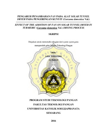 WIDAGDO, LISA (2016) PENGARUH PENAMBAHAN FAN PADA ALAT SOLAR TUNNEL DRYER PADA PENGERINGAN KUNYIT (Curcuma domestica Val.). Other thesis, Prodi Teknologi Pangan Unika Soegijjapranata Semarang.