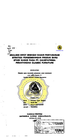 SUBAGYO, YOHANES AGUS (1997) ANALISIS SWOT SEBAGAI DASAR PENYUSUNAN STRATEGI PENGEMBANGAN PRODUK BARU STUDI KASUS PADA PT. CALISTAPRIMA PIRANTIINDAH CLASSIC FURNITURE. Other thesis, Prodi Manajemen Unika Soegijapranata.