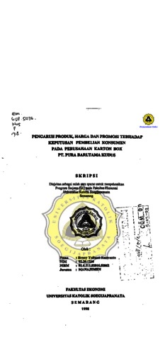 KUSWANTO, HENNY YULIANTI (1998) PENGARUH PRODUK, HARGA DAN PROMOSI TERHADAP KEPUTUSAN PEMBELIAN KONSUMEN PADA PERUSAHAAN KARTON BOX PT. PURA BARUTAMA KUDUS. Other thesis, Prodi Manajemen Unika Soegijapranata.