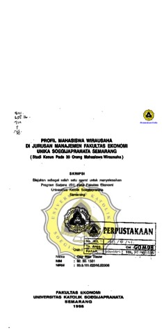 ¥Jisis moneter berdampak pada banyak bid811g seperti properti, konstruktor, perbankan, perstektilan, dan lain sebagainya. Pengefisiensian para tenaga kerja yang dikenal dengallllama Pemutusan Hublmgan Kerja (PHK) meningkat, baik dipelllsahaan berskala besar maupnn menengah dan keeil. Jumlah pengangguran yang terns bertambah sedangkan biaya hidnp teros meningkat, hal ini dapat menimbulkan kerawallan dan kekacauan di banyak bidang, seperti bidang perekonomian, sosial, budaya, politik, pertahanan dan kerunamm. Lapangan pekerjaan yang semakin sempit dan semakin sulit diem-i, sedangkan jwnlah angkatan pencari kerja meningkat, perlu mendapat penallganan dan perhatian khuBUS dari pemerintah. Para angkatan kerja muda tidak terkecuali para mahasiswa yang sudah lulus tidal< luput terkena dam~ak krisis moneter ini. Selama lIll maha~iswa masih terikat pada pola pilf kalau mereka sudah lulus, mereka akan mencari pekerjean di tef!lIUll ~ang sudah m m (i t orang).· Padahal kenyataanrtya persaingan semakin tinggi, yang haak mampu fiersamg an tersisih dan menganggur, dan akhinlya menjadi f)elJall bagi pemerintah dan negara; Peneliti menemukan adan wembah811 ola pikir dan pola perilaku bebernpa mahasiswa di F has Bleon mi JWlJsan Man~eme Unika Soegijnpranata Semarang. Para mahasiswa tersebut disamping te~ erkuliaR. dan belalm:-" mereka mengelola snafu usaha ~ang bersin mandiri. Ada ~ang berger di bidang ;produksi, dagang, mauplm j aSal TIengan usaba mandiri tersebut mereka seeara fimmsial CIapat meneukupi kebutuhan pe Jliahan tanpa bergaqfl}n.s pada orang tti8lwali.; an tidak menutup kemungkinan a ter iptanya lap,angan kj rj31 barn sehingga dal?~ menyerap tenaga kerja baru pul Kondisi inilah yan kemudiall peneliti untUk melihaf secara lebih deka! profil mahru iswa wira&saha tersebut. Berd arkan kohdisi jni peneliti fertarik unluk melakuk 1 enelitiall tentang profil mabasi a wiraus a; Peneliti menetapkan30 orsRDg mahasiswa yang diharapkan dapat mewa~i h seluruh Opulasl m asi~wa wirausaha di Fakultas Ekonomi · Manajemen Unika Soegij8J!nntata i\dap fORik yang penelitl alIas adaJah «Profil Mahasiswa 'Vir saba Di JWlJsan Man~emell F ltas Ekonomi Unika SoegUaprananata Sema~g (Studi KaSl s P~a 30 0 anf Mahasiswa Wirausaha)". Sedrutgkall tnasalah di mas' hd bagaimana ·ofit 3 limlg mahasiswa winmsaha dilihat dari aspek-aspeK kewirausafiaan !~ melipnti aspek kepribadian, aspek kemrunpuan berhubmlgan dengan orang-orang, nspek keahlian mengatur, aspek keahlian pemasaran dan aspek keahlian keuangan. Mahasiswa wir8Usaha yang dimaksud adalah individu yang memnnfaatk311 waktu luangnya diluar kuliah dan bel~ar dengan meItialankan usaba. yang bersifat mandiri. Mahasiswa wirausaha disini dilihat berdnsarkan jenis kelrunin, ciri usaha mandiri, jenis usaha mandiri dan lokasi usaba mandiri. Usaha mandiri disini dilihat berdasarkan suatu jenis usaha yang hanya membutuhkrul modal relatif kecil, m311ajemen yang sederhan~ tidak terlalu menyita waktu dan bersifat orienta.~i tertuju padalaba dimana pemilik sekaligus pengelolanya Tujuml penelitiml ini adalnh Wltuk mendap~an profil mnhasiswa wiransaba di Fakultas Ekonomi JWlJsan Manajemen Unika Soegijapranata dilihat dari lima aspek kewirausahaan. Kegunaan penelitirul ini adalah: · 1. Basi mahasiswa wiraueaha, penelitian ini bien menjadi bahan intropeksi dan evaluasi diri Wltuk peningkatan kinerja. 2. Basi pihok-pihok yang berkepentingan dengan mahasiswa wirausaha diharapkan dapat memberikan konfribusi terhadap upaya-upaya pengembangan suatu usaba malldiri melalui penentuan kebijnkan, pembinaan dan pengarahan. 3. Bagi pembaca, sebagsi tmnbaban pengetabuan dan bab8ll pertimbang8ll bagi yang ingin mengetahui topik ini. Sistematika penulisan sebagsi berikut: Bah pertama dibahas nmgenai latar belakang masalab, perumusan dan pembatasan masalah, tujuan dan kegunaan penelitian serta sistematika penulisan. Bah kedua dibabas tentang 18llda.~811 teori yang relevan dan mendukung penelitian dalam hal ini dibahas pengertian wirausaha, indikator profil kewirausahaan, kerangka pikir dan defmisi operasional. Bah ketiga diuraikan tentang metode pellelitian meliputi jenis penertian, obyek penelitian dan lokasi penelitian, populasi dan sampel, teknik pengump I data dan metode analisa data. Bah keempat diw'aikan tentang gambaran umum =esp n(len daahasil analisis penelitian. Bab kekima diuraikan tentang kesim u an dan saran yang tliberikan eneliti kepada responden d8ll pihak-pihak terkait. Dalam tiqj an pustaka dikemukakan teori-teori y g elevan dan menduktmg penelitian ini teru ama tentang irausnha dan aspek-aspek k~ iransahaan. Antara lain diungkapkan bahwa kewiraus8haan adalali suatu jiwa yang pant g mundur dan pantang menyerah daJ mengh api tantang di sekitamya dan se mn andai melihat kesempat y8llg ada u~fuk mengemb usabanya. Wirausaha aa ISh individu y8llg menjalankan nsaha dalJUll meningkattt t hidup baik pribadi mmlpun pihak-pihak disekitamya elalni gengelolaan usall"a y. sehat deng8ll cara;.. ara yang etis dan bersib. Us aha mandiri merupakml suatu jenis usma y~ penge olaannya sedemana, modal yang tl butuhkan relatifkecil, titlak terlal menyita aktn d berorienta.~i pada Isba (profit ~riented) dimana pemilik sekali81ls pengelola:: Atas flasar cara an tarm pembahaBan masalahllya, penel~ ian ini merupakan penelitian des . tif, terbbtJ!S pad s-aha menyingk;flPkan euatq uasalah dan keada8Il sebagai mana. anya. sehingg .MB"-Y- merup an penyingkaH8ll falda tentang profil kewir911snhann mallasiswa Fal5dtas Ekonomi Jurus Man~ emelll Unika Soegijapranata Semar- g. Obyek penelitian adalah para: mahasiswa wirausaha di FakuItas Ekonomi ManaJem-e-It"-Unika Soegijapranata emar sebanyak 30 orang. Data mengenai . iilentitas :esp-onden y~ oerwirausaba peneliti beroleh dari rekall mahasiswa dan langsung d . pora IMasiswa wirausoha sebanyak 30 orang~ Selanjutnyajawaban responden yang diperoleh melalui kuesioner berstruktm- dianaJisis dengan membaca data yang telah diolah berdasarkan skor jawahan responden menm