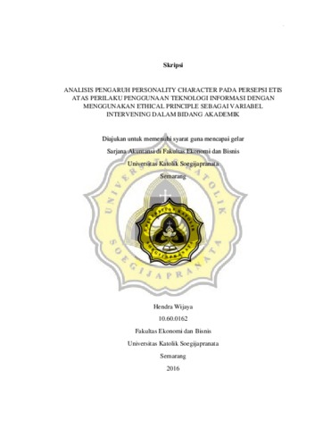 Wijaya, Hendra (2016) ANALISIS PENGARUH PERSONALITY CHARACTER PADA PERSEPSI ETIS ATAS PERILAKU PENGGUNAAN TEKNOLOGI INFORMASI DENGAN MENGGUNAKAN ETHICAL PRINCIPLE SEBAGAI VARIABEL INTERVENING DALAM BIDANG AKADEMIK. Other thesis, Fakultas Ekonomi dan Bisnis Universitas Katolik Soegijapranata.