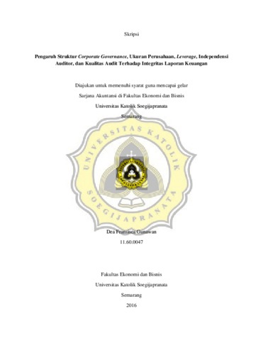 Gunawan, Dea Fransisca (2016) Pengaruh Struktur Corporate Governance, Ukuran Perusahaan, Leverage, Independensi Auditor, dan Kualitas Audit Terhadap Integritas Laporan Keuangan. Other thesis, Fakultas Ekonomi Dan Bisnis, Universitas Katolik Soegijapranata.