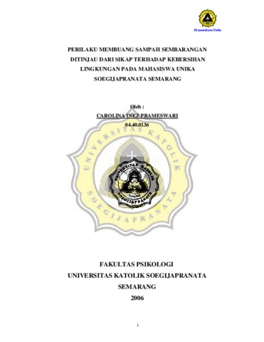 PRAMESWARI, CAROLINA INEZ (2006) PERILAKU MEMBUANG SAMPAH SEMBARANGAN DITINJAU DARI SIKAP TERHADAP KEBERSIHAN LINGKUNGAN PADA MAHASISWA UNIKA SOEGIJAPRANATA SEMARANG. Other thesis, Prodi Psikologi Unika Soegijapranata.