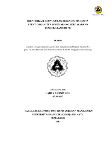 KURNIAWAN, HARRY (2012) IDENTIFIKASI KEUNGGULAN BERSAING MAHKOTA EVENT ORGANIZER DI SEMARANG BERDASARKAN PENDEKATAN COYNE. Other thesis, Prodi Manajemen Unika Soegijapranata.