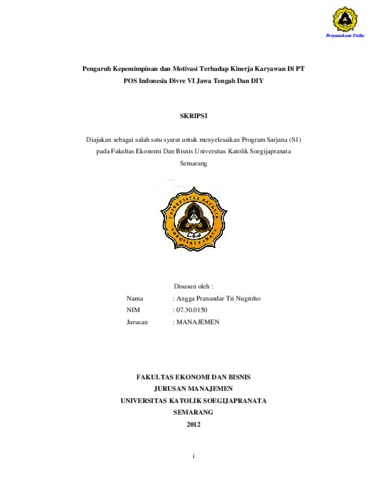 TRI NUGROHO, ANGGA PRANANDAR (2012) Pengaruh Kepemimpinan dan Motivasi Terhadap Kinerja Karyawan Di PT POS Indonesia Divre VI Jawa Tengah Dan DIY. Other thesis, Prodi Manajemen Unika Soegijapranata.
